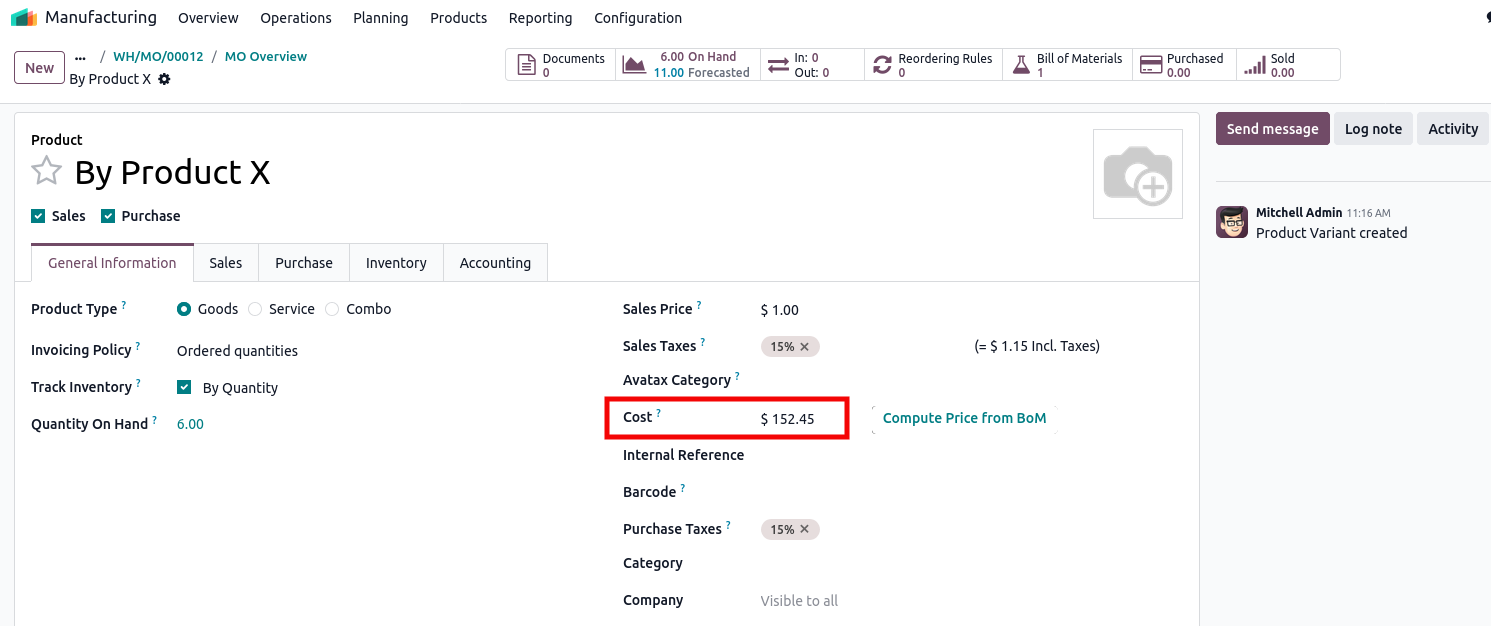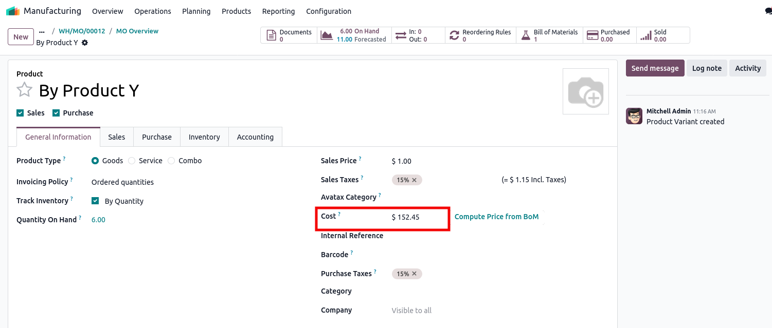 When you manufacture the main product, Odoo calculates 50% (or your set percentage) of the total production cost (materials + operations) and assigns that as the cost of the byproduct.