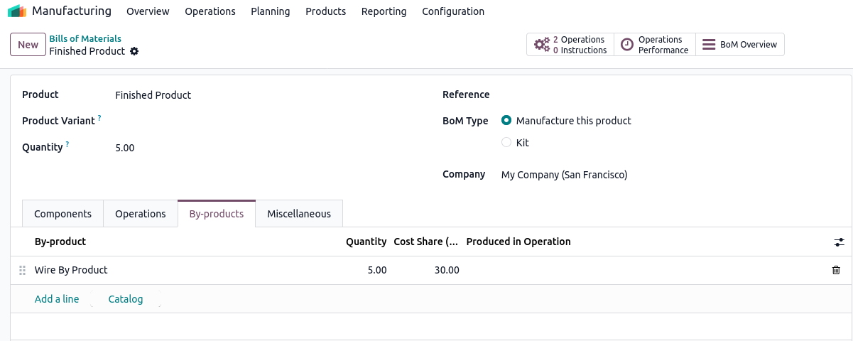 Once installed, the Cost Share (%) field becomes visible on the By-Products tab of the BoM.
