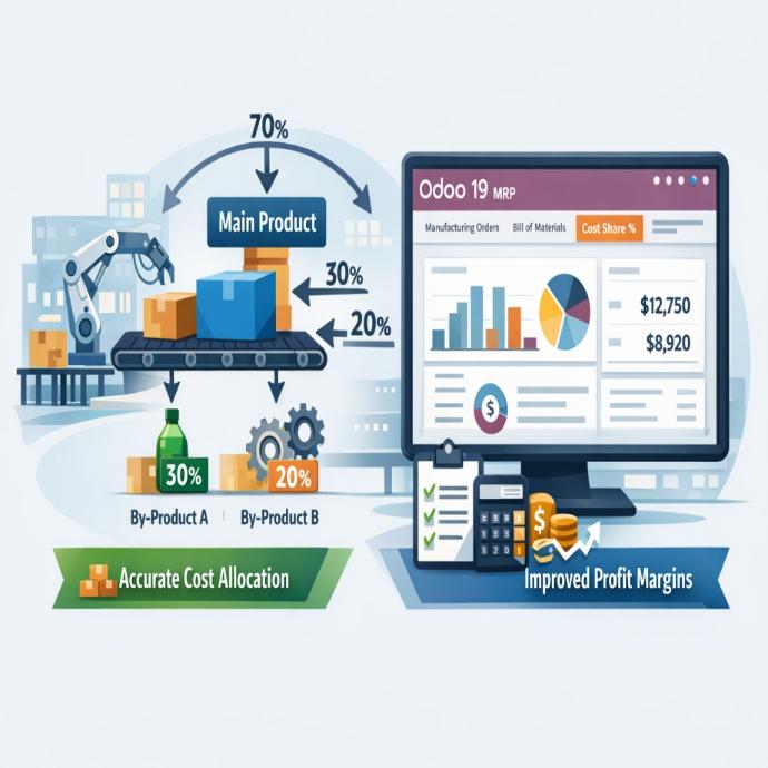 In Odoo 19 and beyond Manufacturing, Cost Share (%) is a standard mechanism for distributing indirect production costs between the main finished product and any by-products generated within the same manufacturing order. This functionality is particularly valuable in industries where secondary outputs are produced alongside the primary product and require accurate cost valuation.